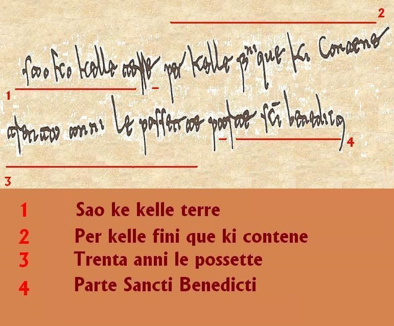 Che tradotti significano : “So che quelle terre, per quei confini che qui si contengono, le possedette per trenta anni la parte di S. Benedetto”.