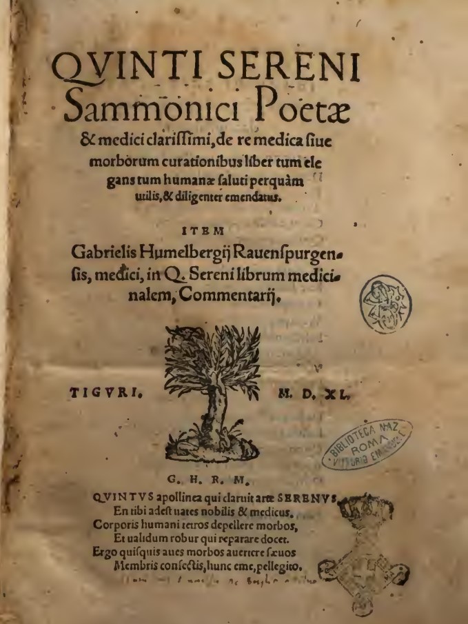 Dei tanti, ne analizzeremo uno del 1540 dell’umanista tedesco, medico e botanico, Gabriel Hummelberger (1487 – 1544), intitolato : “ Quinto Sereno Sammonico poeta e medico illustre, il cui libro sui rimedi medici e le cure delle malattie è utile e accuratamente corretto. Commenti di Gabriel Hummelberger di Ravensburg, anche lui medico, sul libro medico di Q. Sereno.”