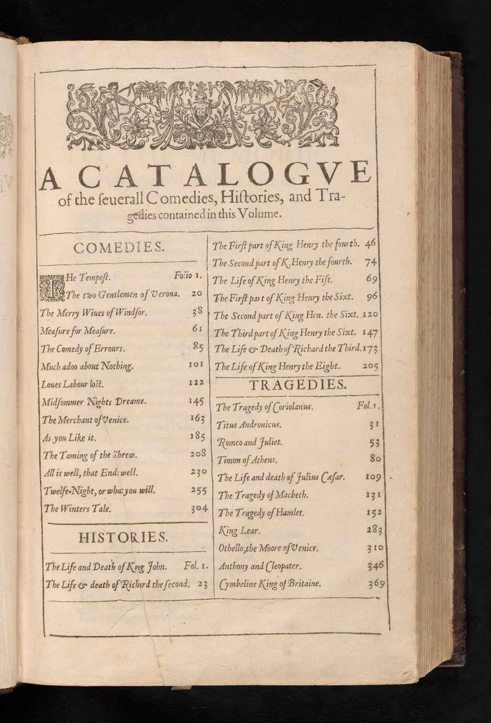 Questo libro è un volume imponente, che raccoglie ben 36 opere teatrali, molte delle quali venivano rappresentate per la prima volta in forma stampata, una raccolta eterogenea che offre un panorama completo della produzione drammaturgica di Shakespeare.