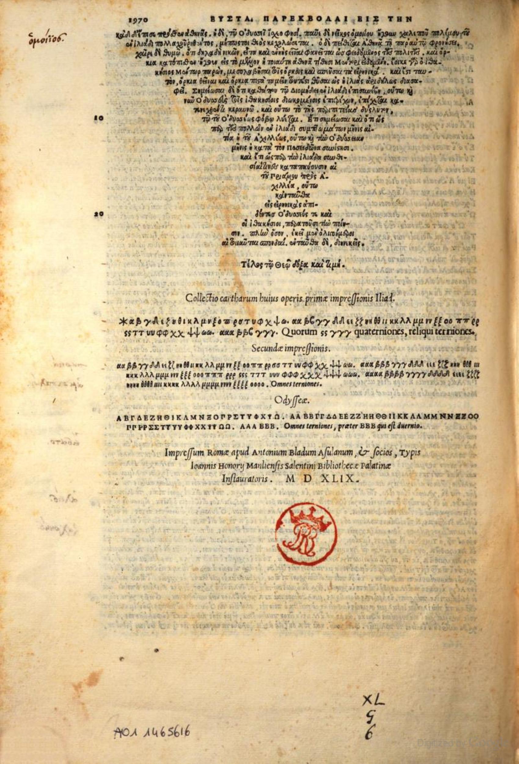 Una prima edizione dei commentari di Eustazio fu pubblicata in quattro volumi a Roma tra il 1542 e il 1550, quello che osserviamo in questo articolo è il terzo volume, pubblicato nel 1549 e conservato alla biblioteca nazionale di Napoli.
